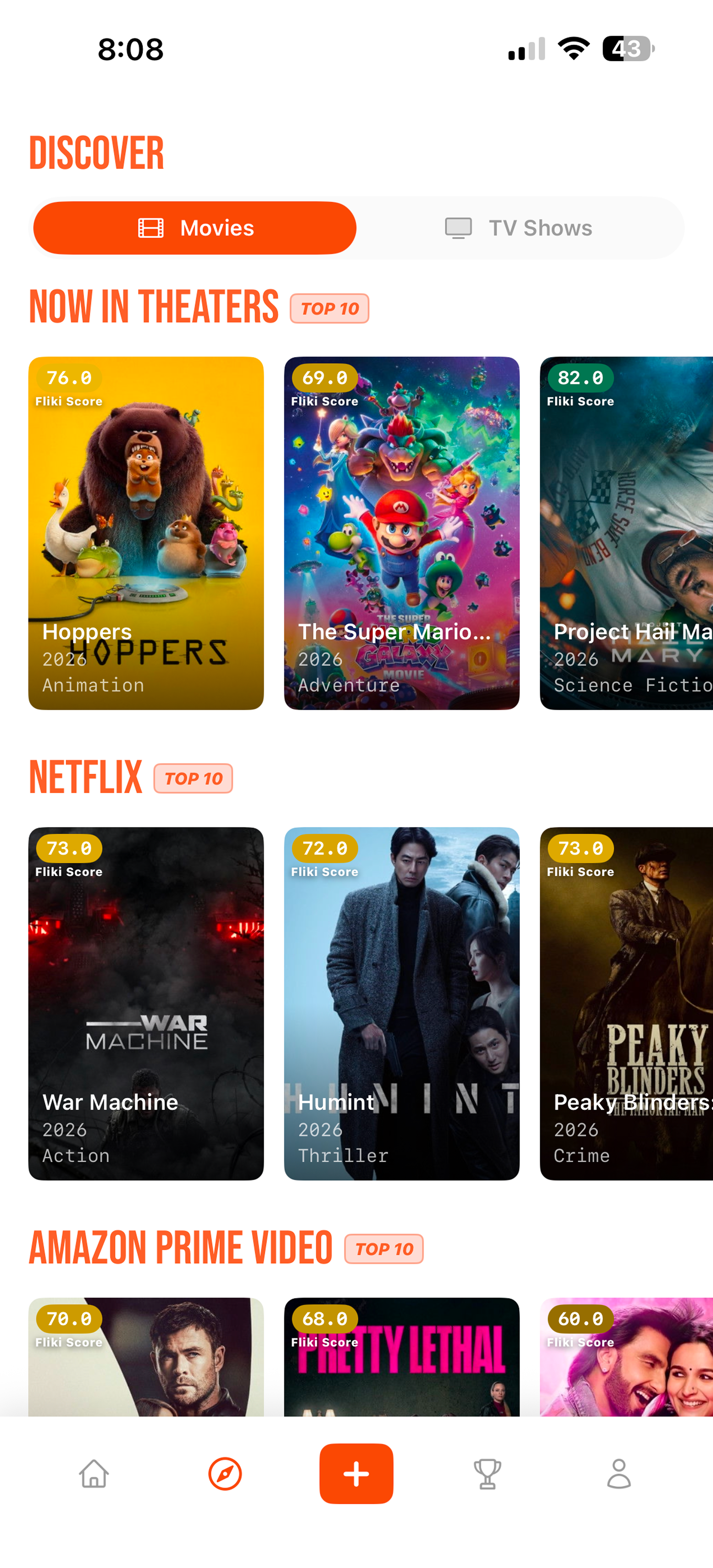Browse what’s now in theaters and the top movies across Netflix, Disney+, Amazon Prime Video, and more — each with a Fliki Score so you know what’s worth watching.