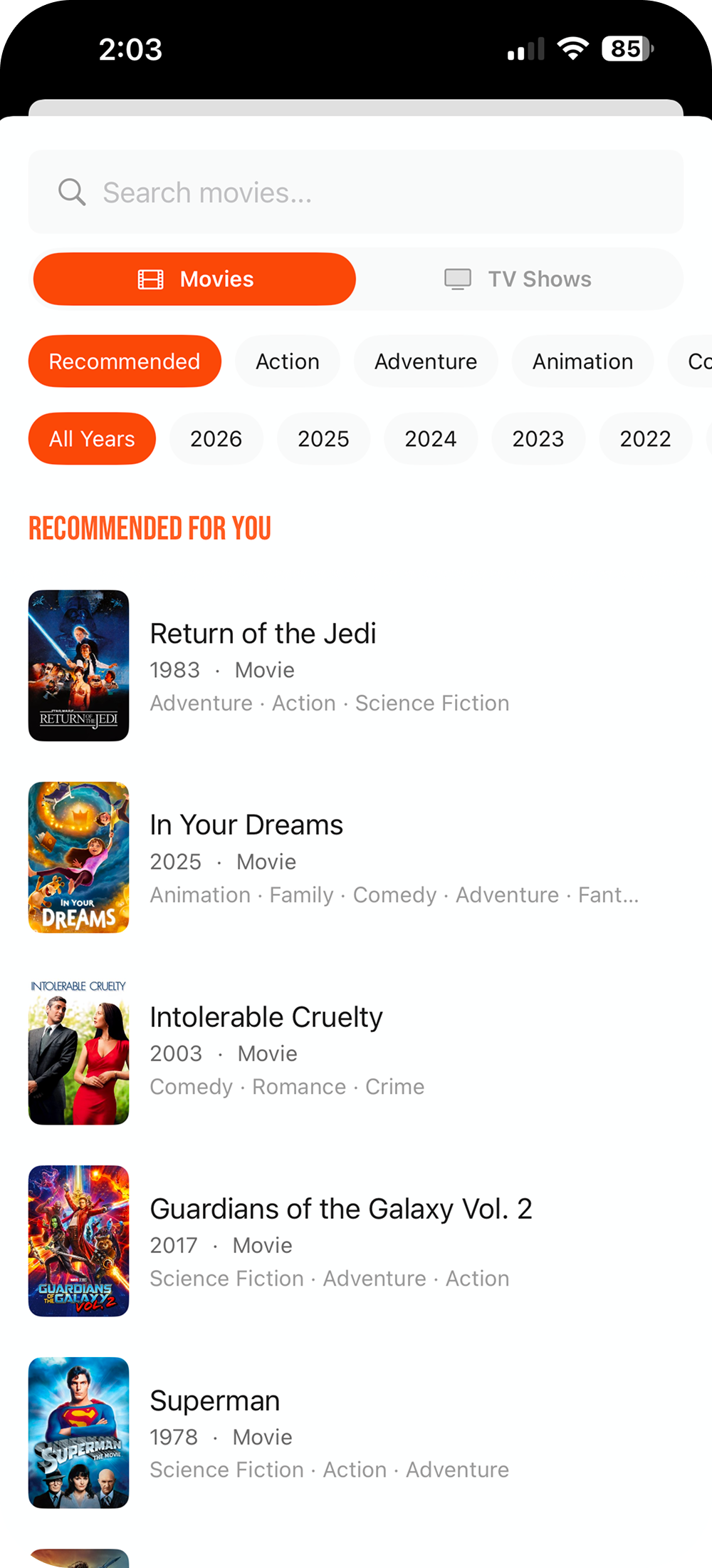 - Switch between Movies and TV Shows with one tap
